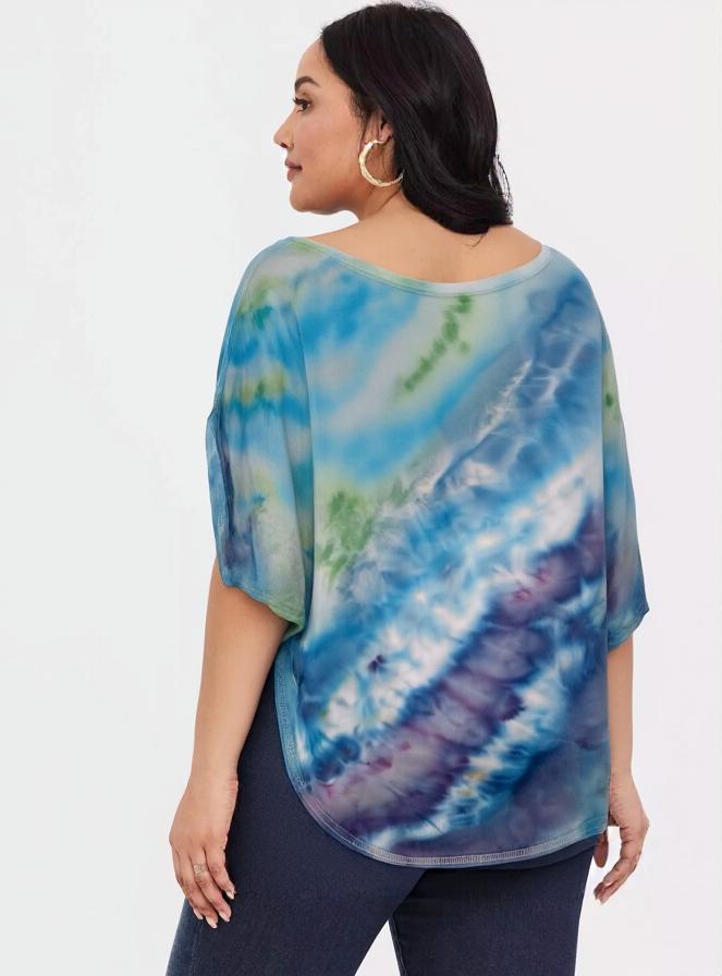 Ice dyed in tropical shades of blue and green, this one of a kind dolman style tee shirt is casual and chic.