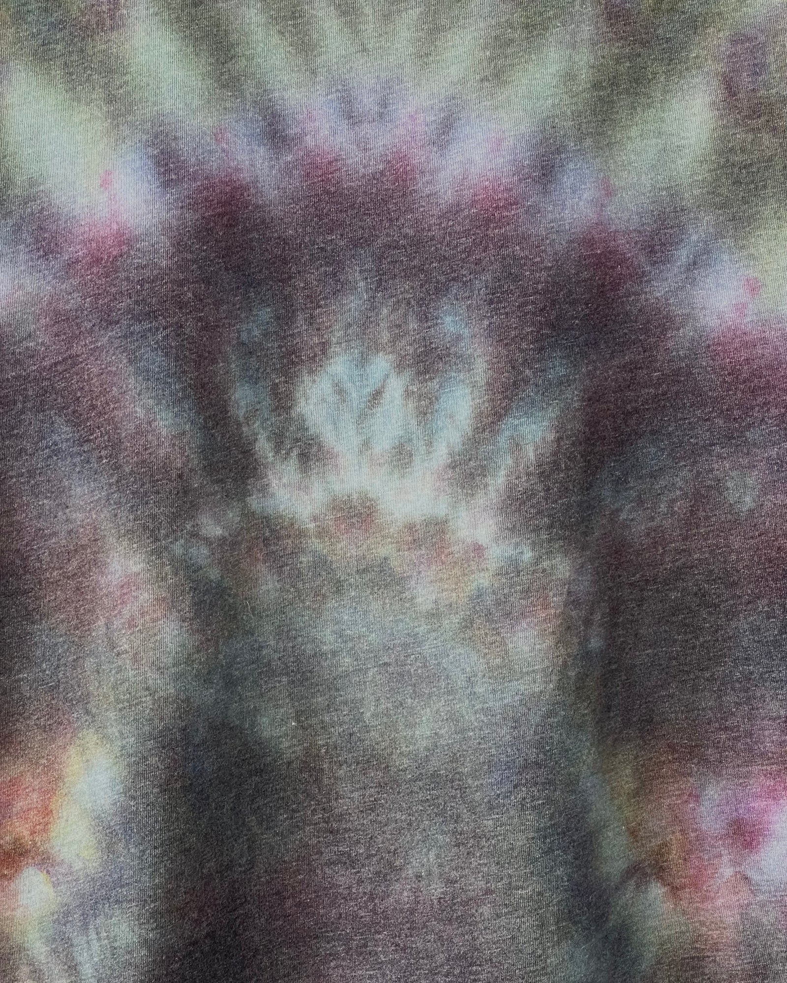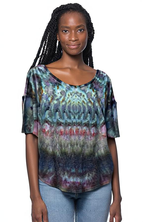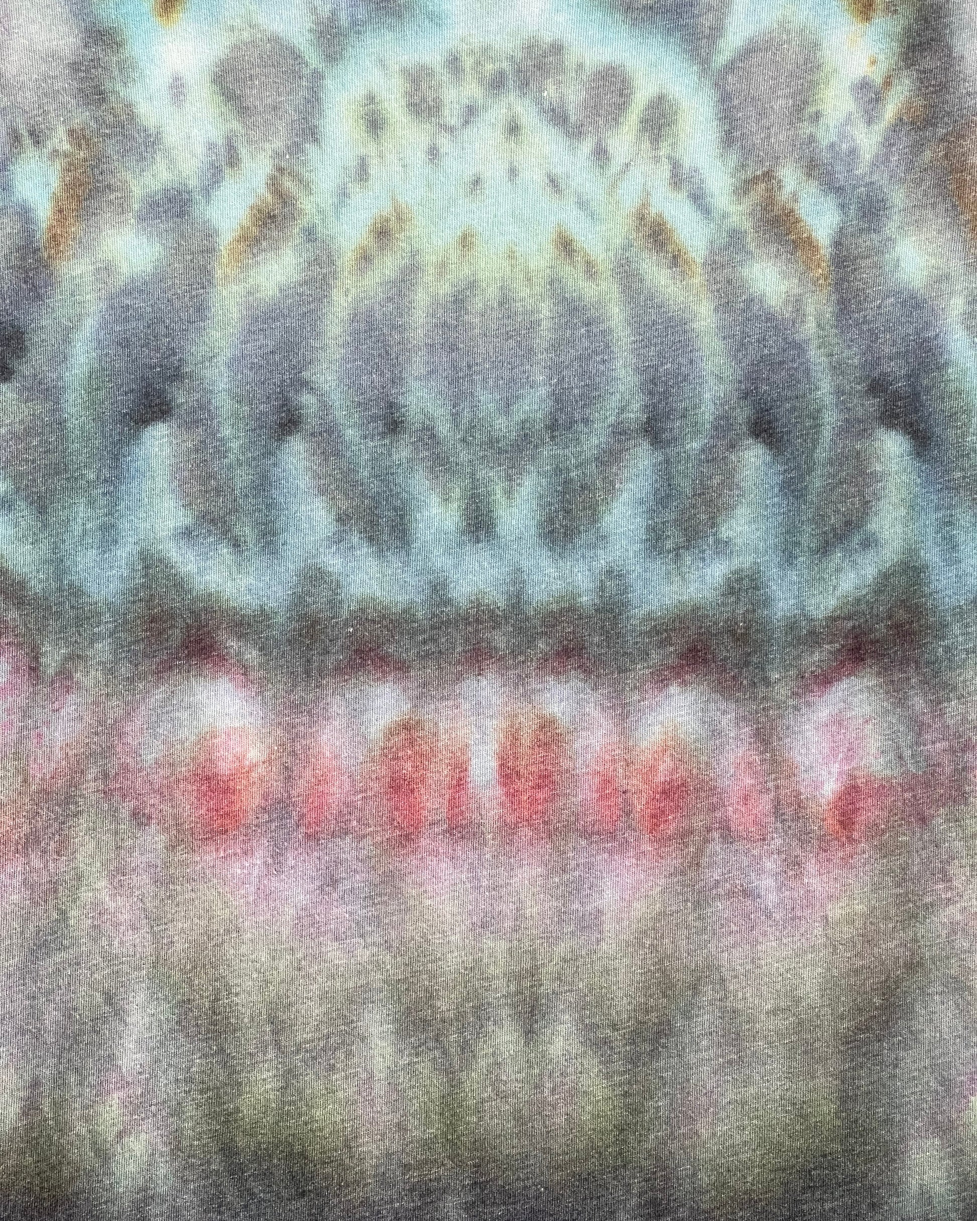 This one of a kind dolman style tee shirt is ice dyed in moody blues and grays. Featuring a chorus of angels rolled technique the pink highlights on dusk shades evoke stormy skies. Casual and chic, it can be worn with jeans or a flowy skirt.