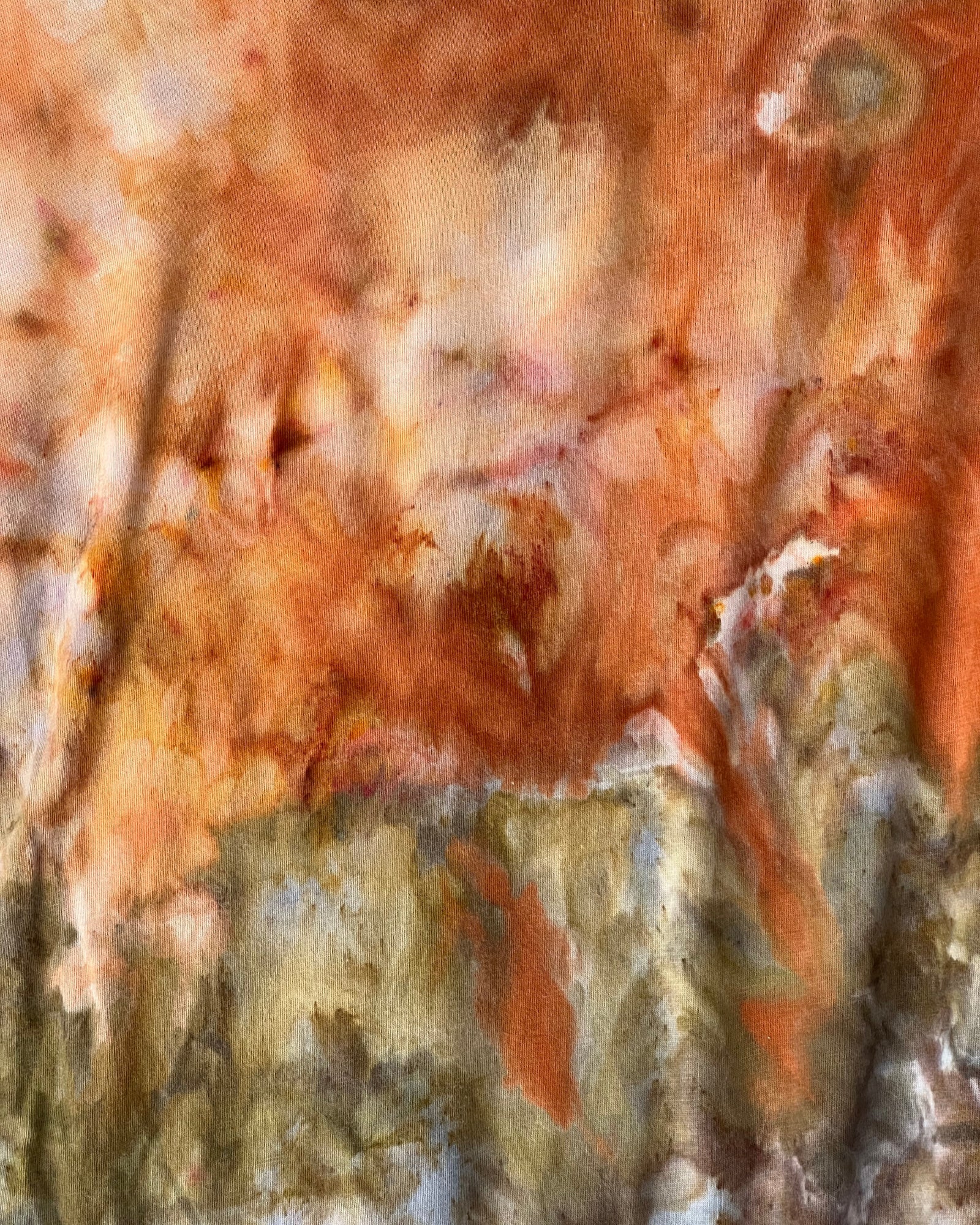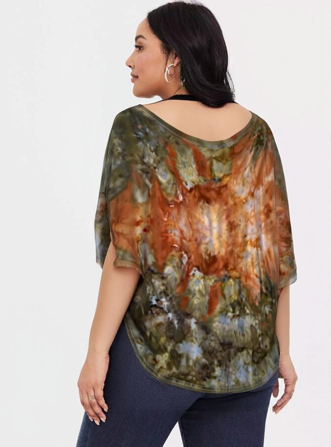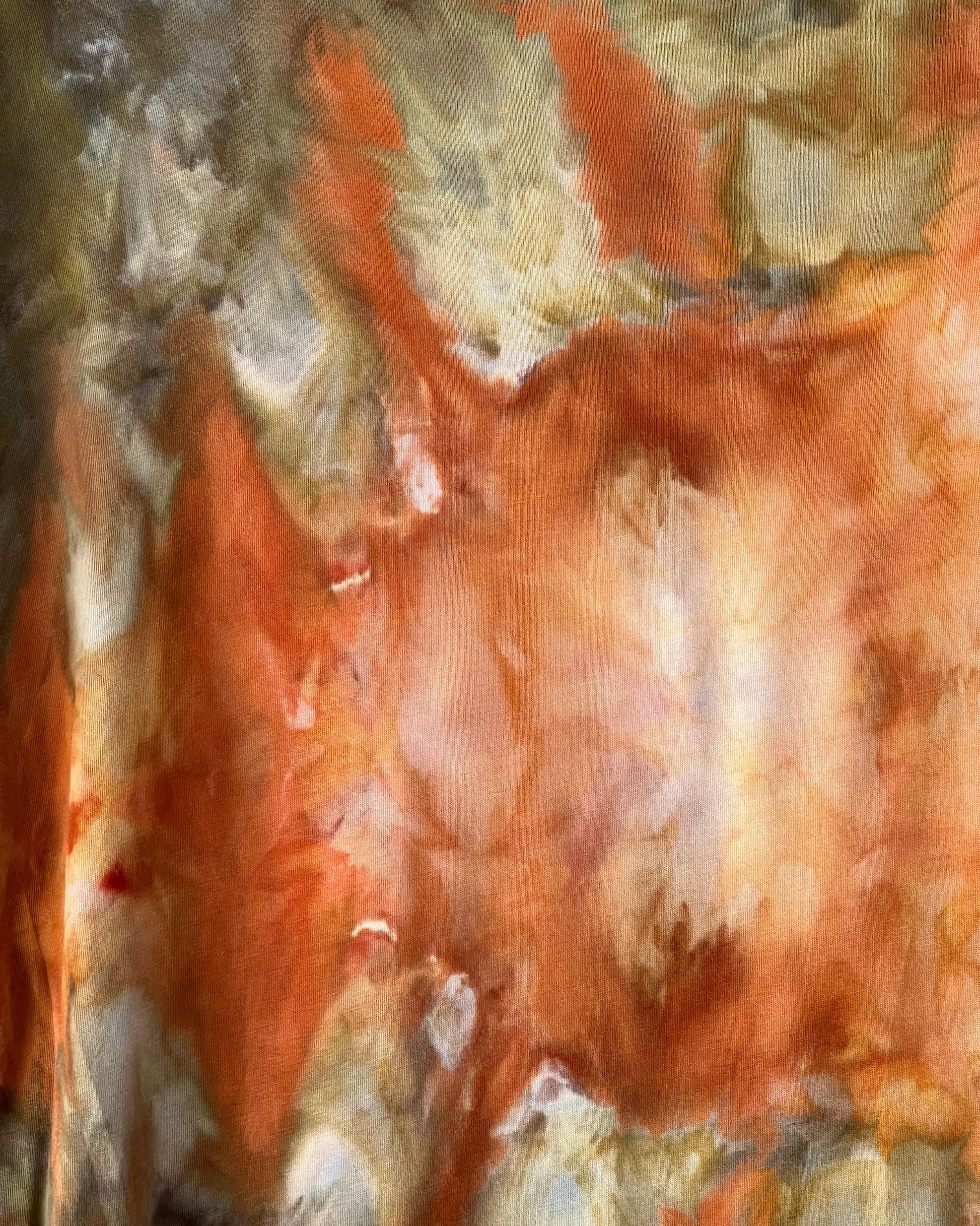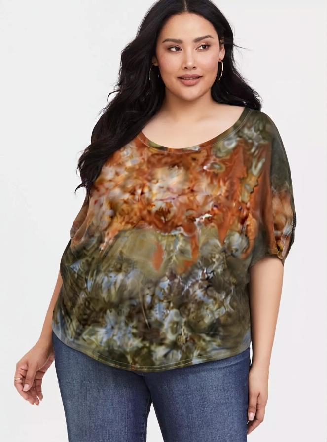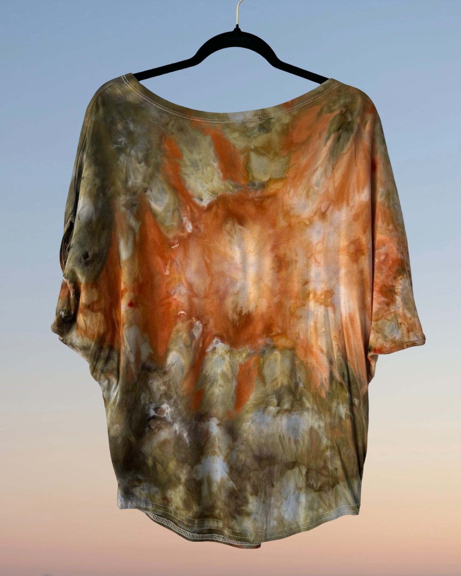 This one of a kind ice dyed dolman style tee shirt features a golden starburst amid an earthy green background. Hip and chic, you will stand out in the crowd with this soft and stylish silhouette. Blended with sustainable and environmentally friendly organic cotton that is silky soft with a great drape. The new shirts are made in the U.S.A.