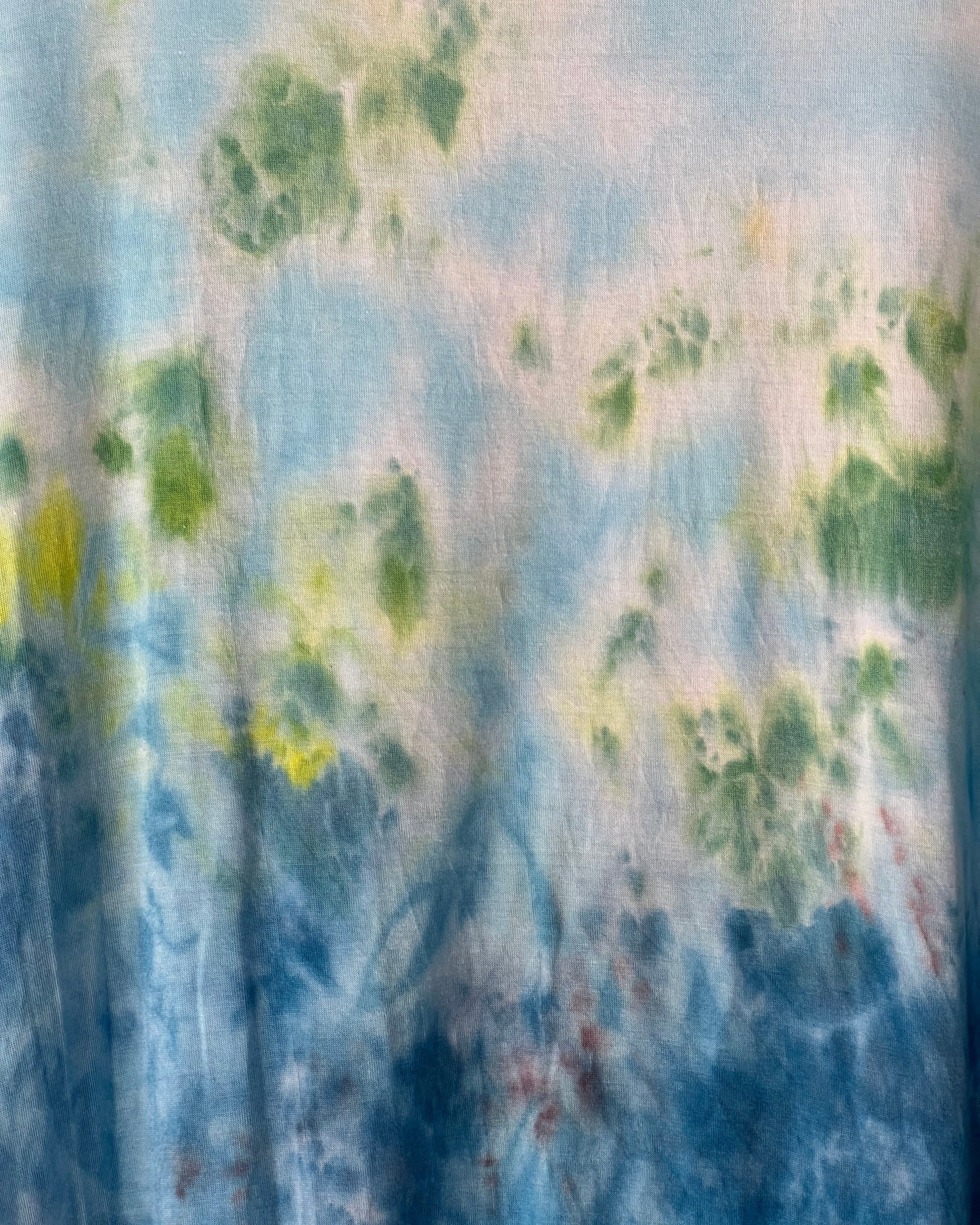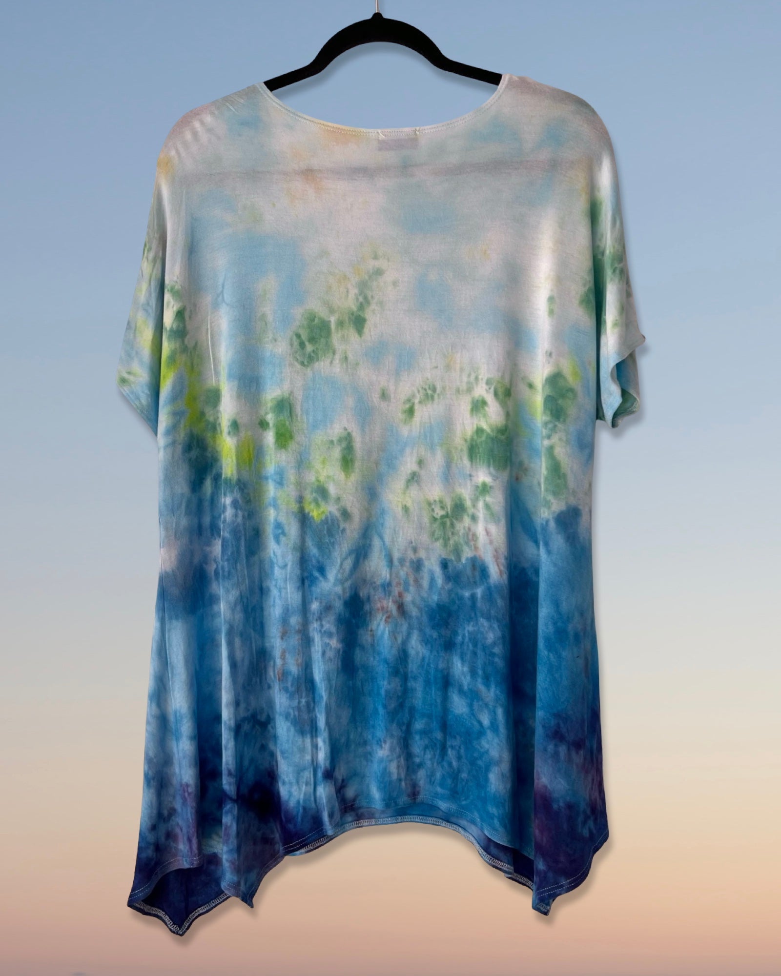 New, American made, flattering asymmetrical style tunic made of 95% rayon and 5% spandex. Ice dyed in an tropical blues and greens. Size Extra Large.