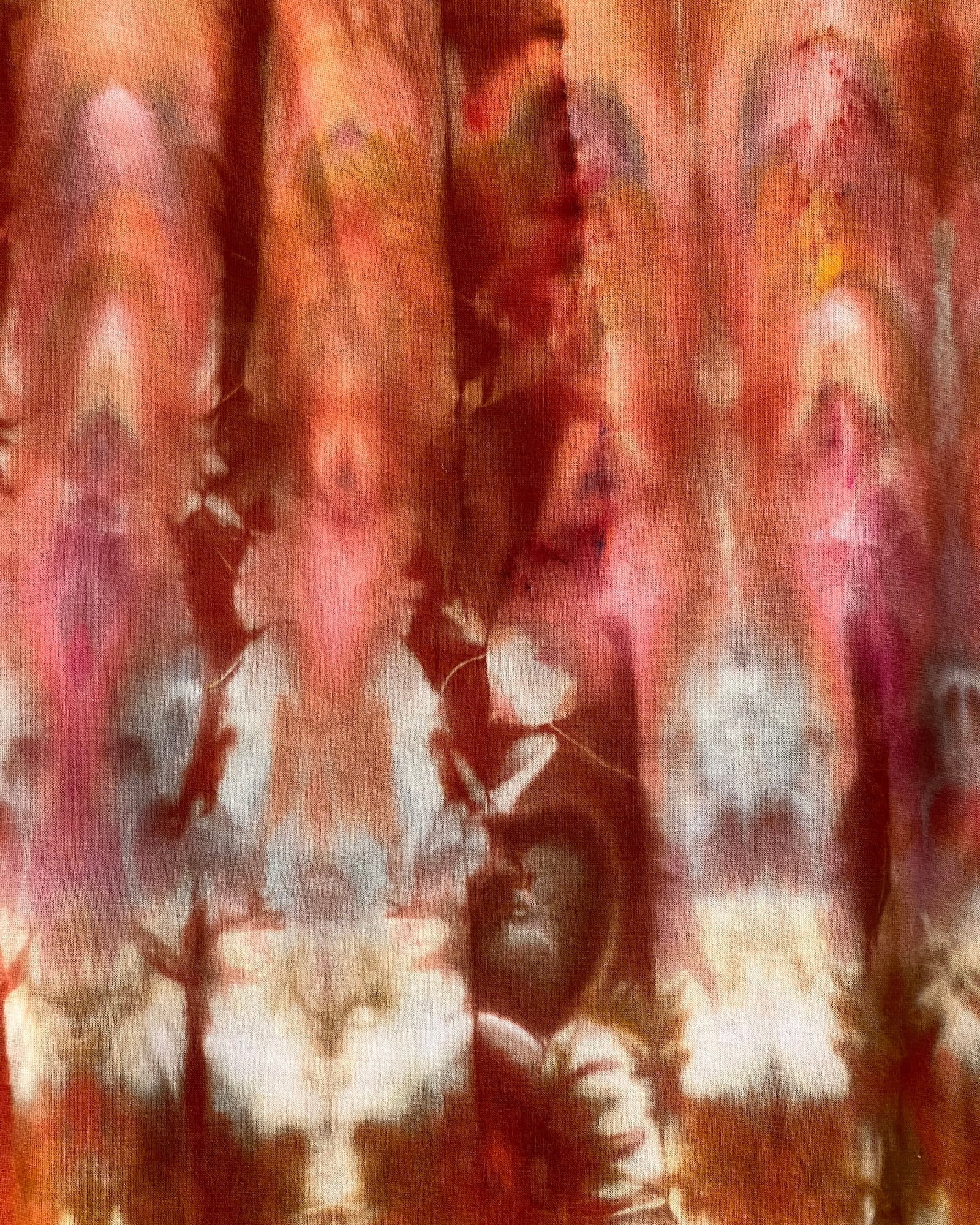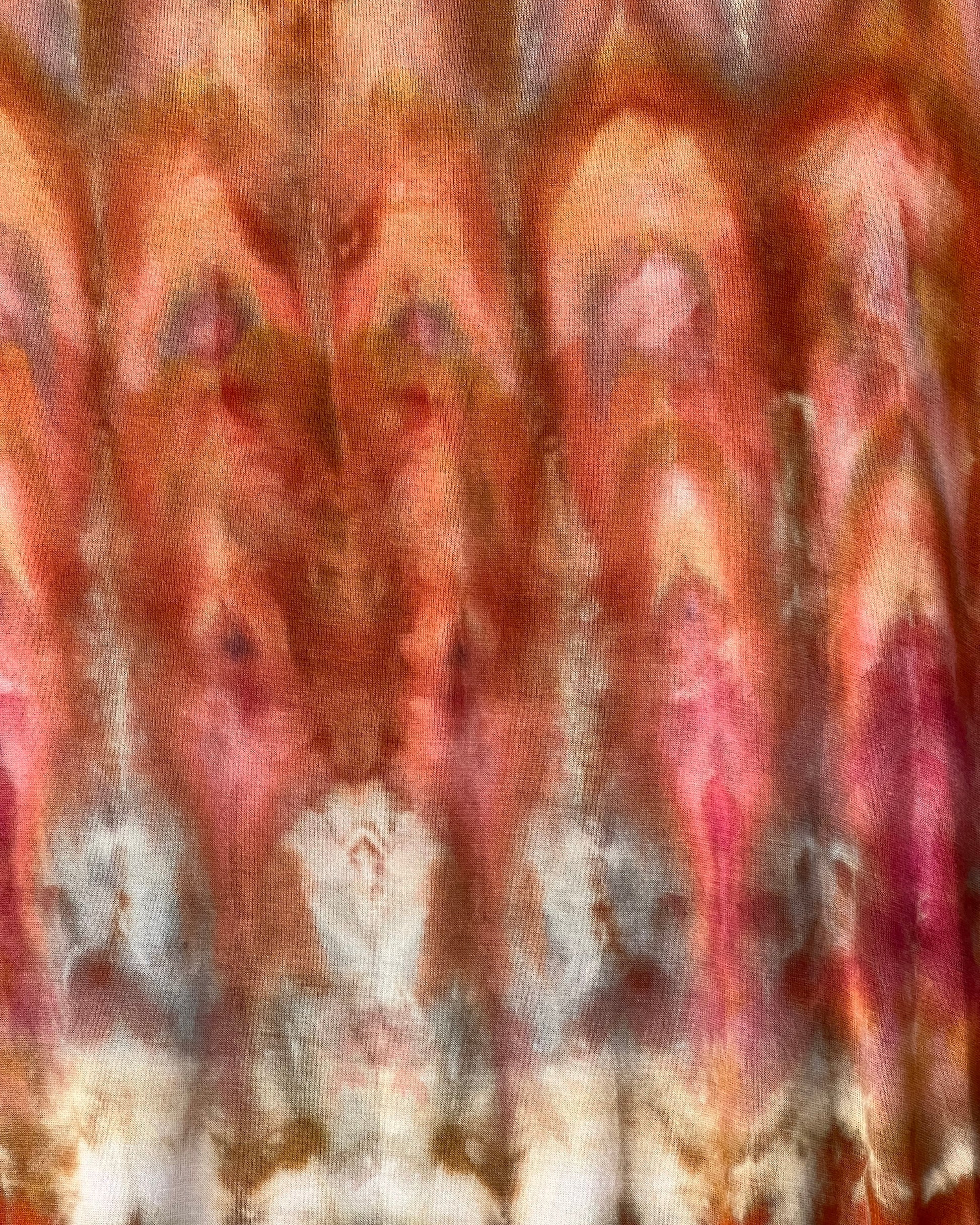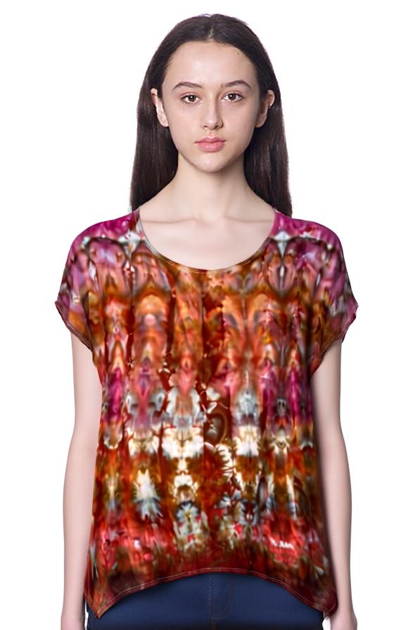 New, American made, flattering asymmetrical style tunic made of 95% rayon and 5% spandex. Ice dyed in peaches, pinks and earthy brown. Size small.