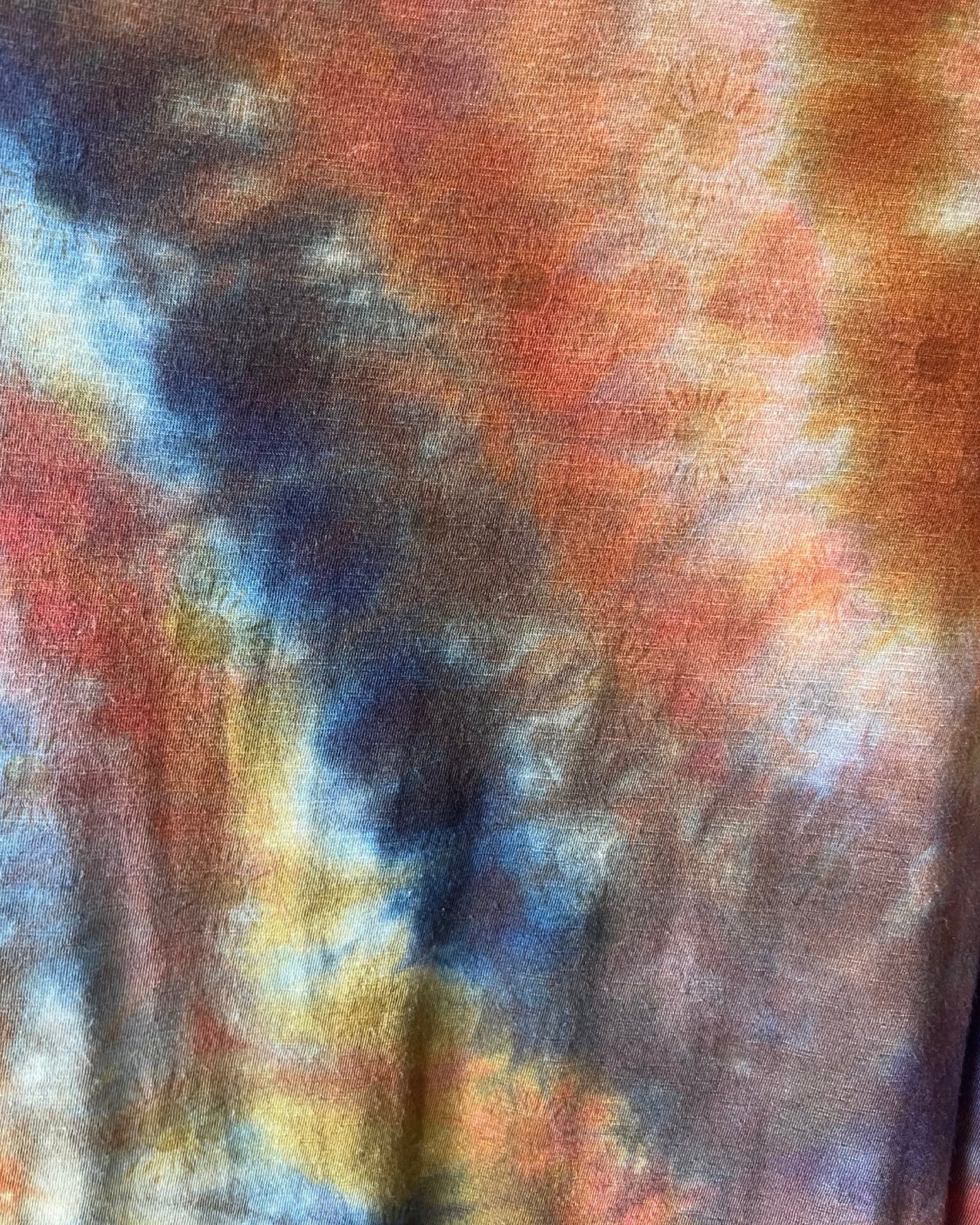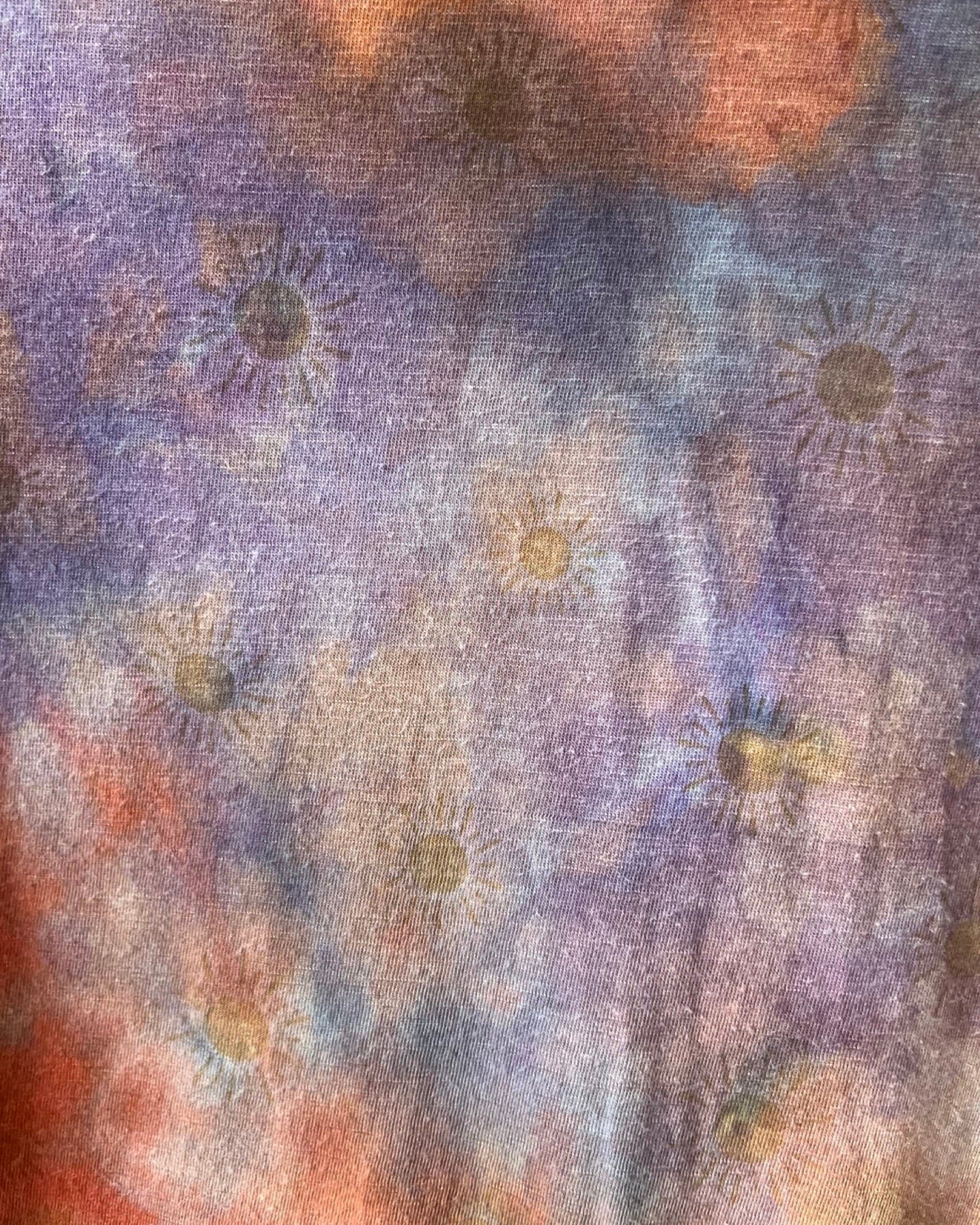 This one of a kind up-cycled designer T with small sun print is ice dyed in soft orange and dusty purple. 100% cotton. Hip length size large.