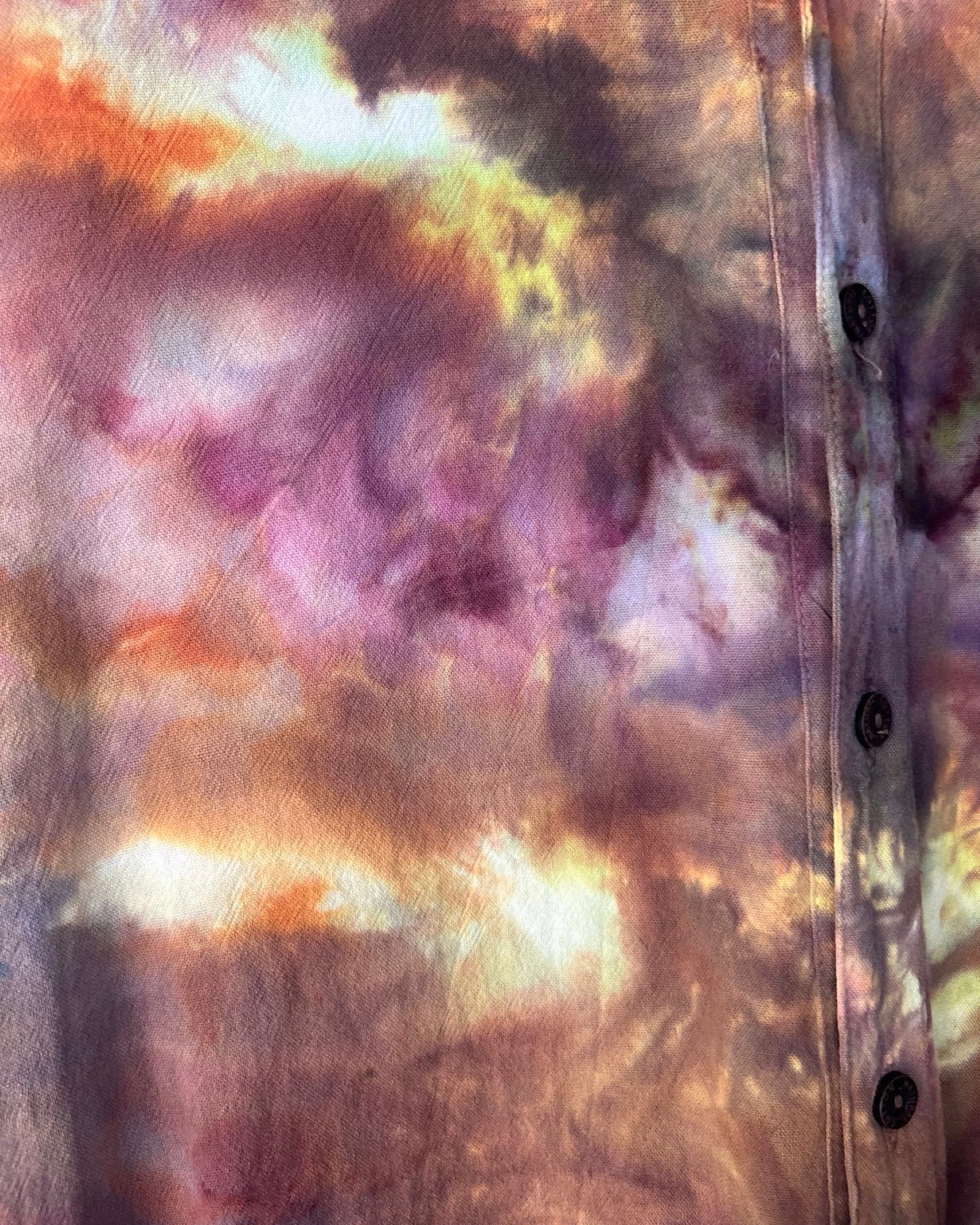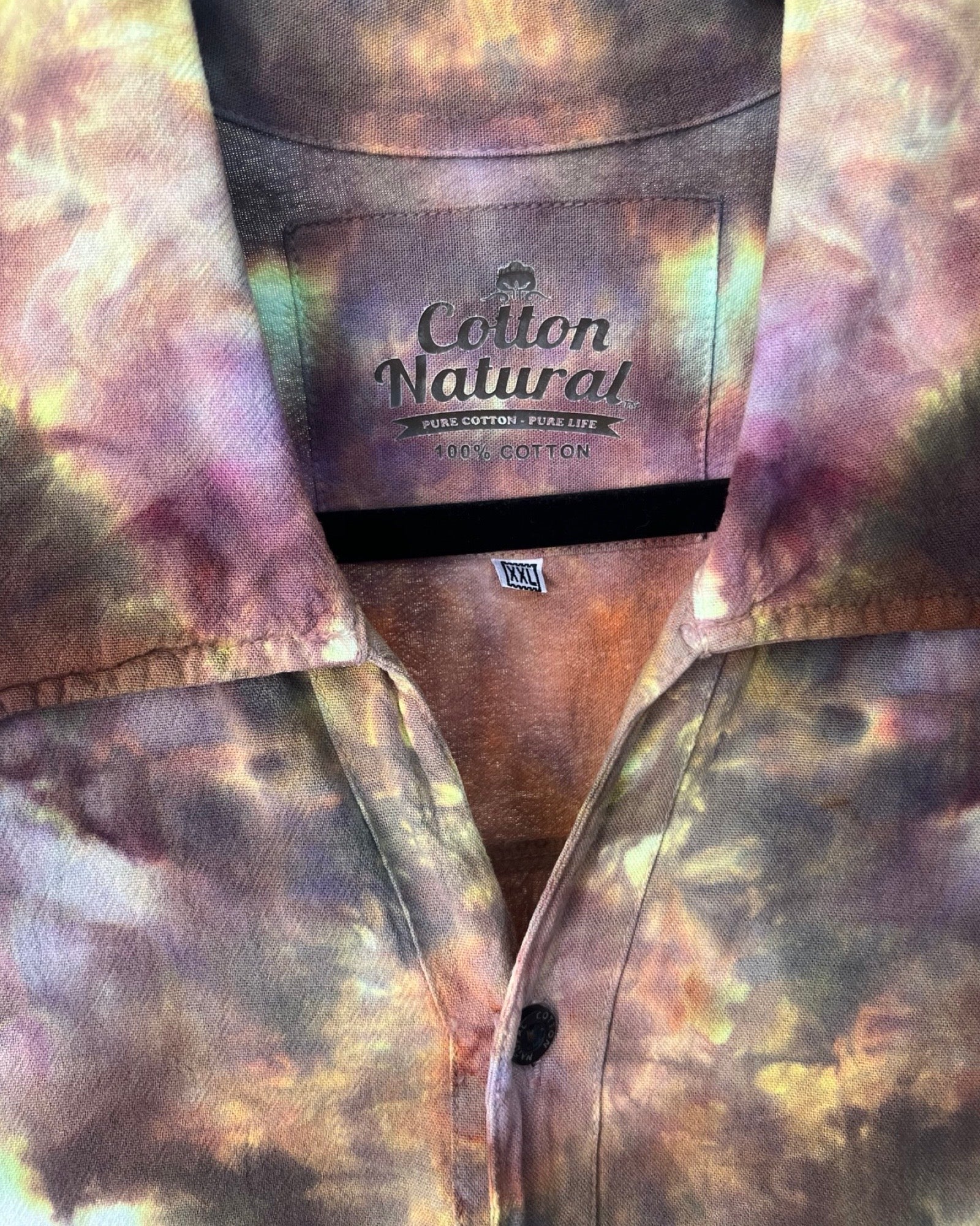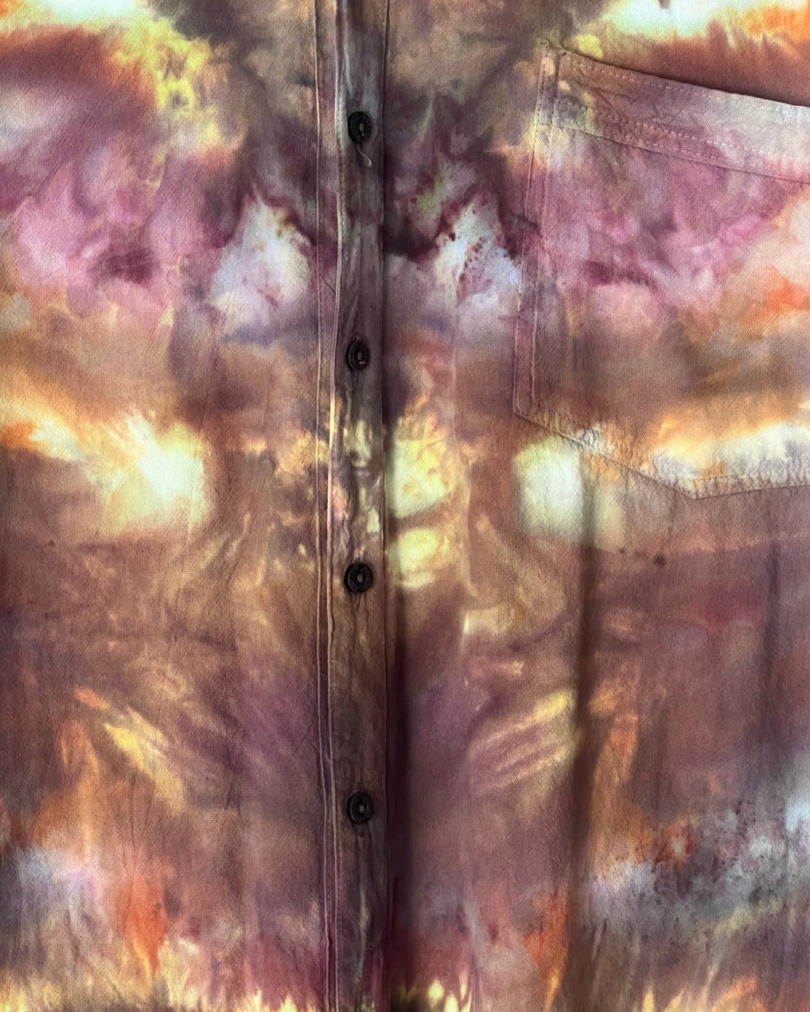 New, 100% cotton camp style button down shirt is ice dyed in golden tones of bronze, purple and rust. Lightweight and cool, the 2XL size is more of a tall fit with extra length. Spread camp collar and single pocket.