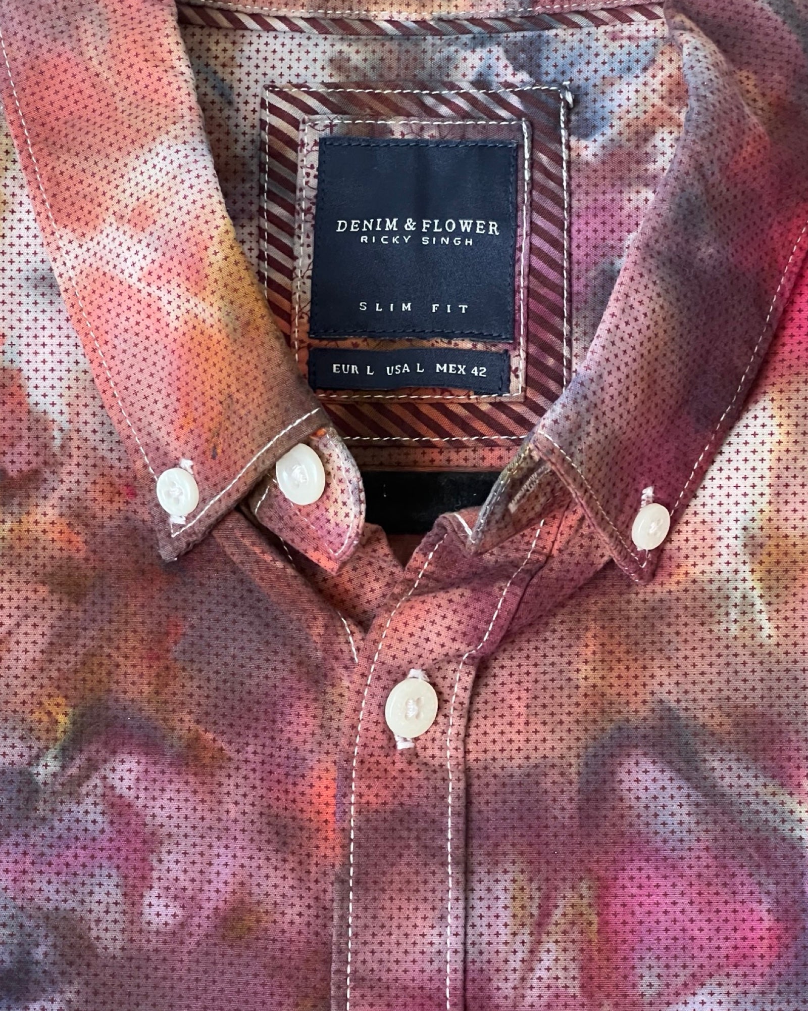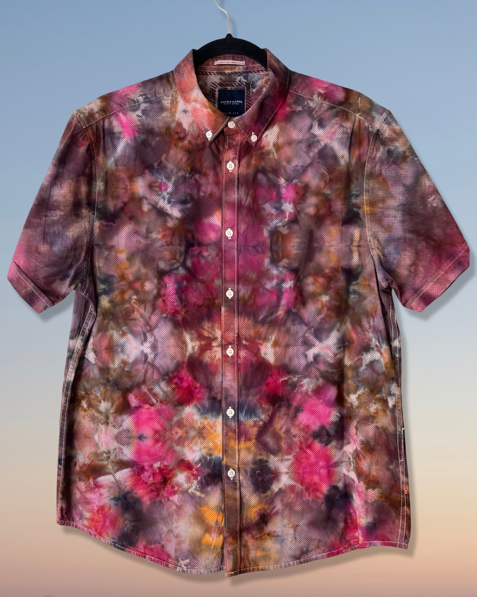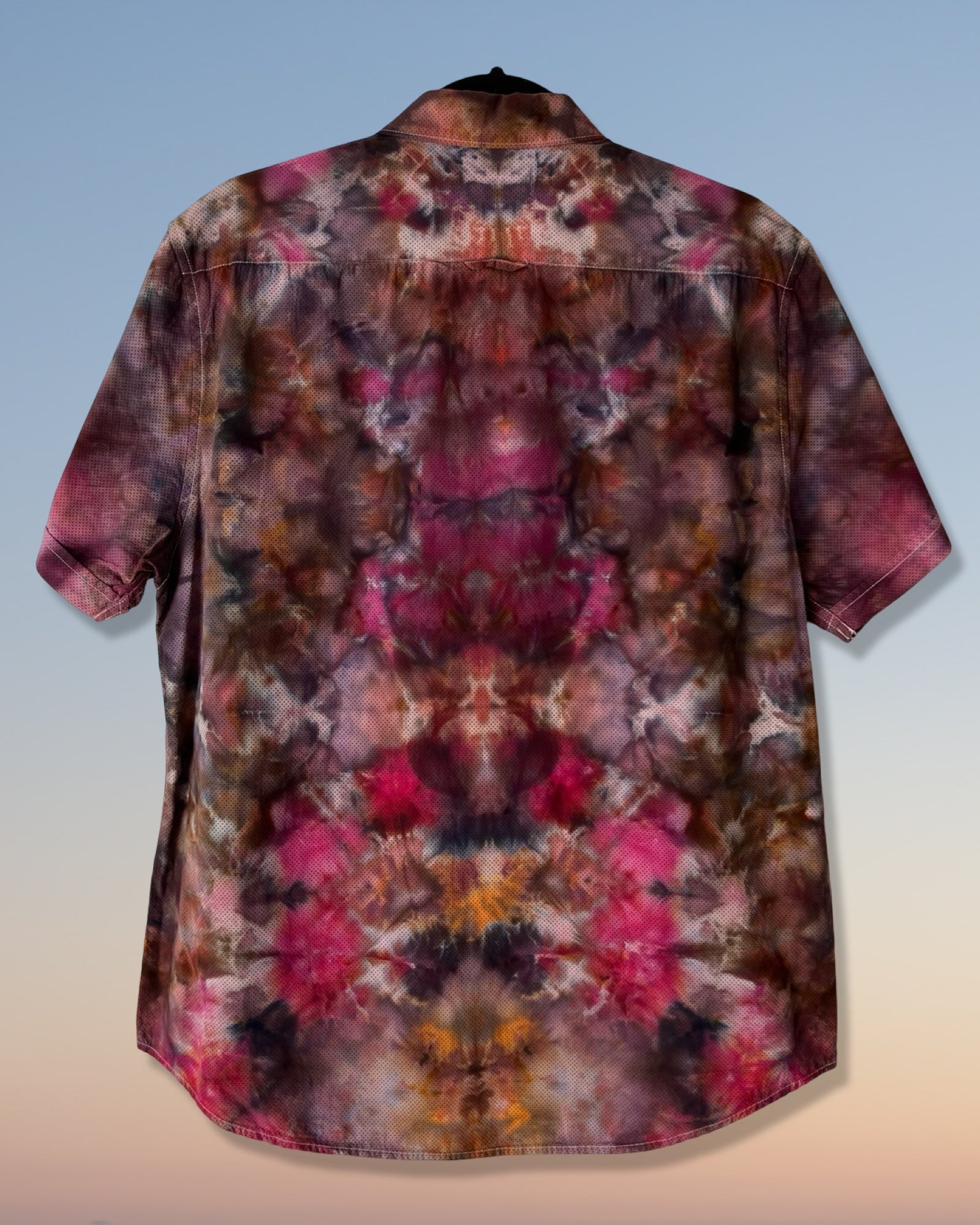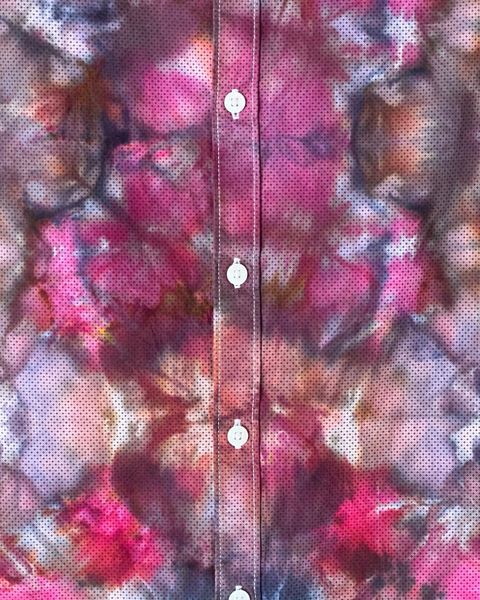 Ice dyed, up-cycled high quality 100% cotton button up shirt is transformed into a vibrant purple maroon psychedelic stunner. A mirrored glitch fold dyed over a tiny repeating dot pattern creates this unique visual story. Truly one of a kind. Button down collar, no pockets and slim fit. The size says large, but it is definitely on the small side of large.