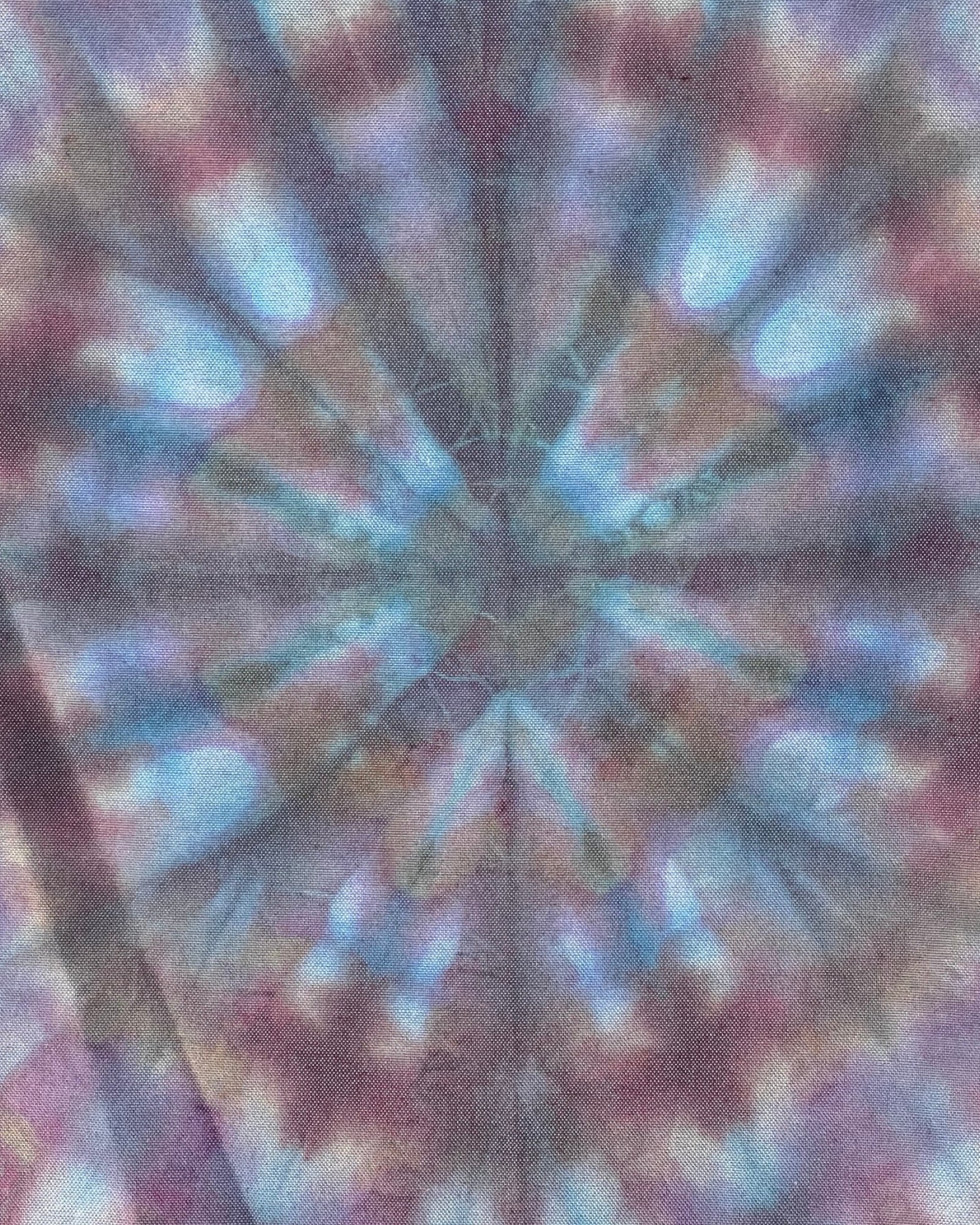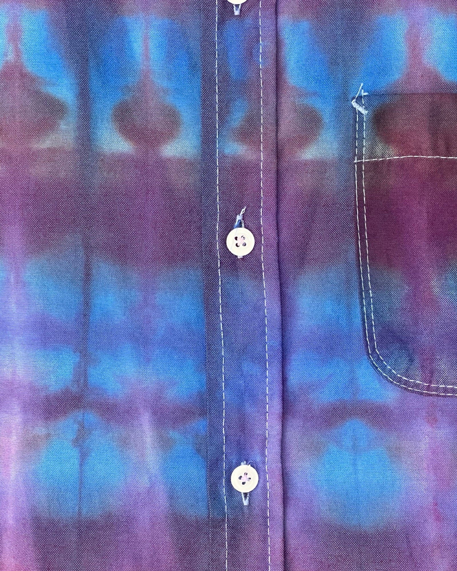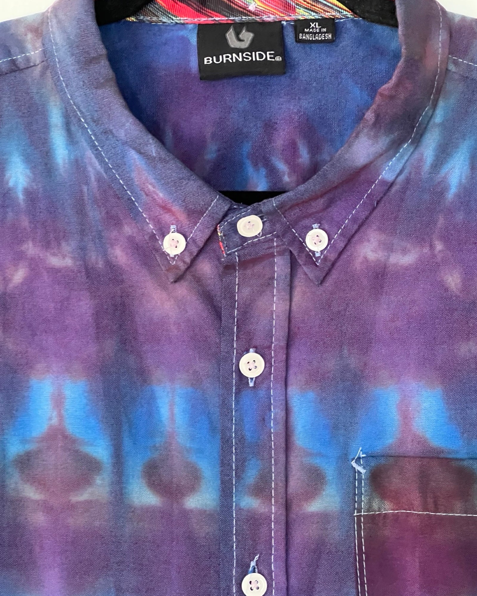 Ice dyed in royal purple and blue, this up-cycled 100% cotton button down men's shirt features a hand tie dyed mandala on the back and vertical pleats on the front. With a single pocket and button collar, this quality shirt will turn heads when you walk into the concert.