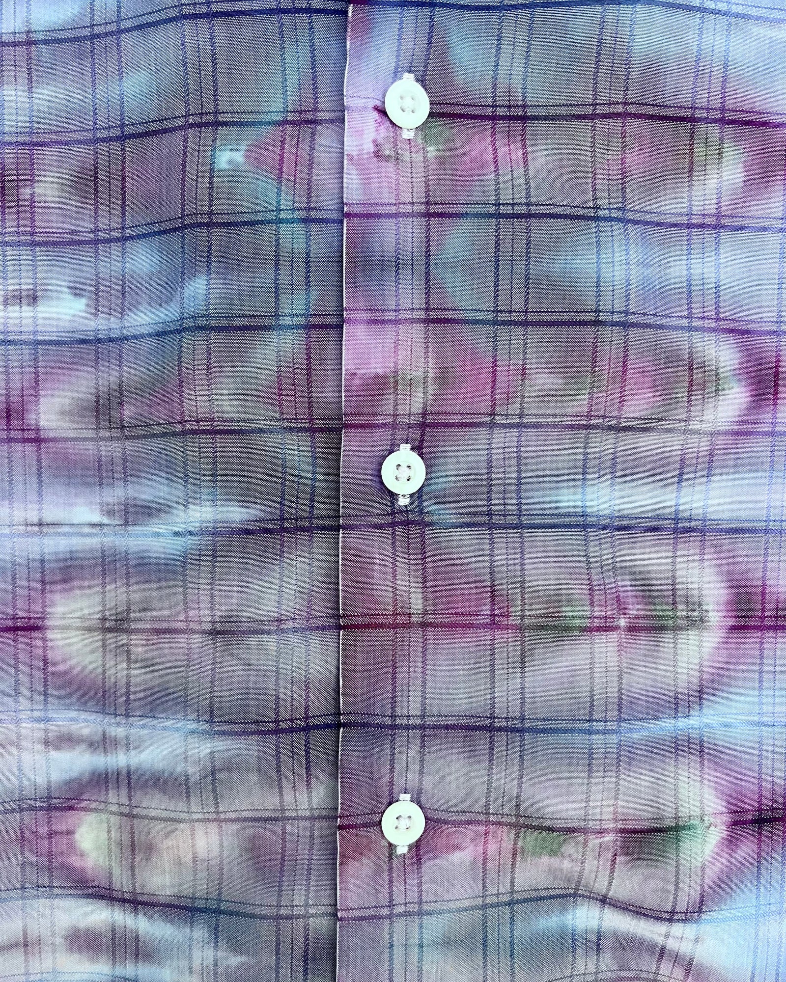 This one of kind up-cycled ice dyed size large mens button down shirt is made from a blend of modal and polyester. Once an all white on white aloha shirt with a wide checked tonal pattern is now more pronounced with the shades of purple and blue ice dyed pleats.