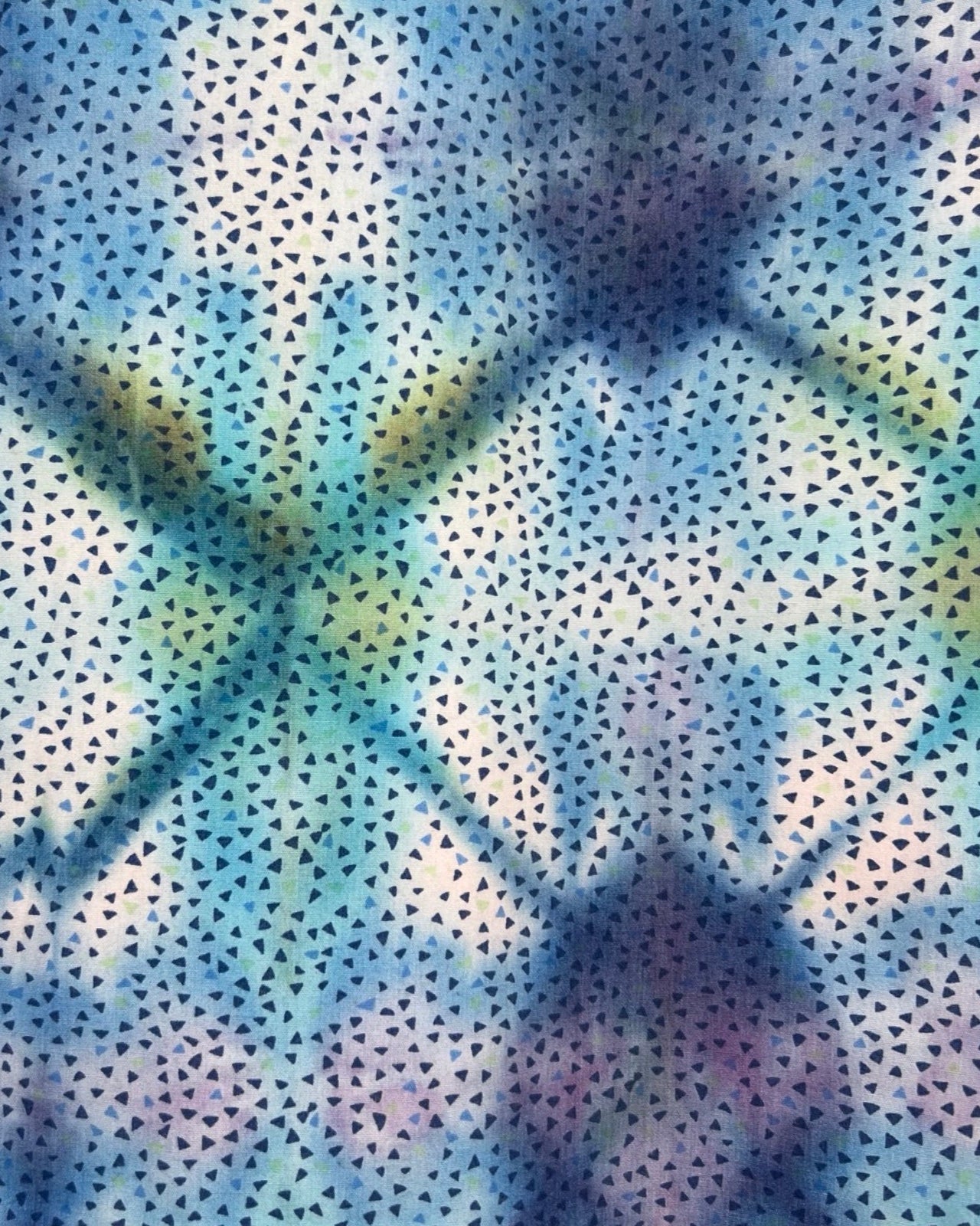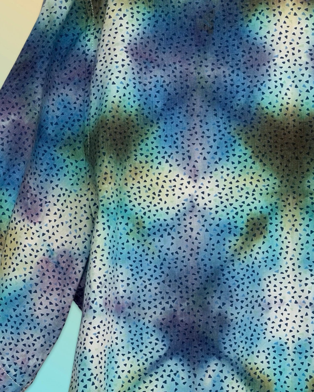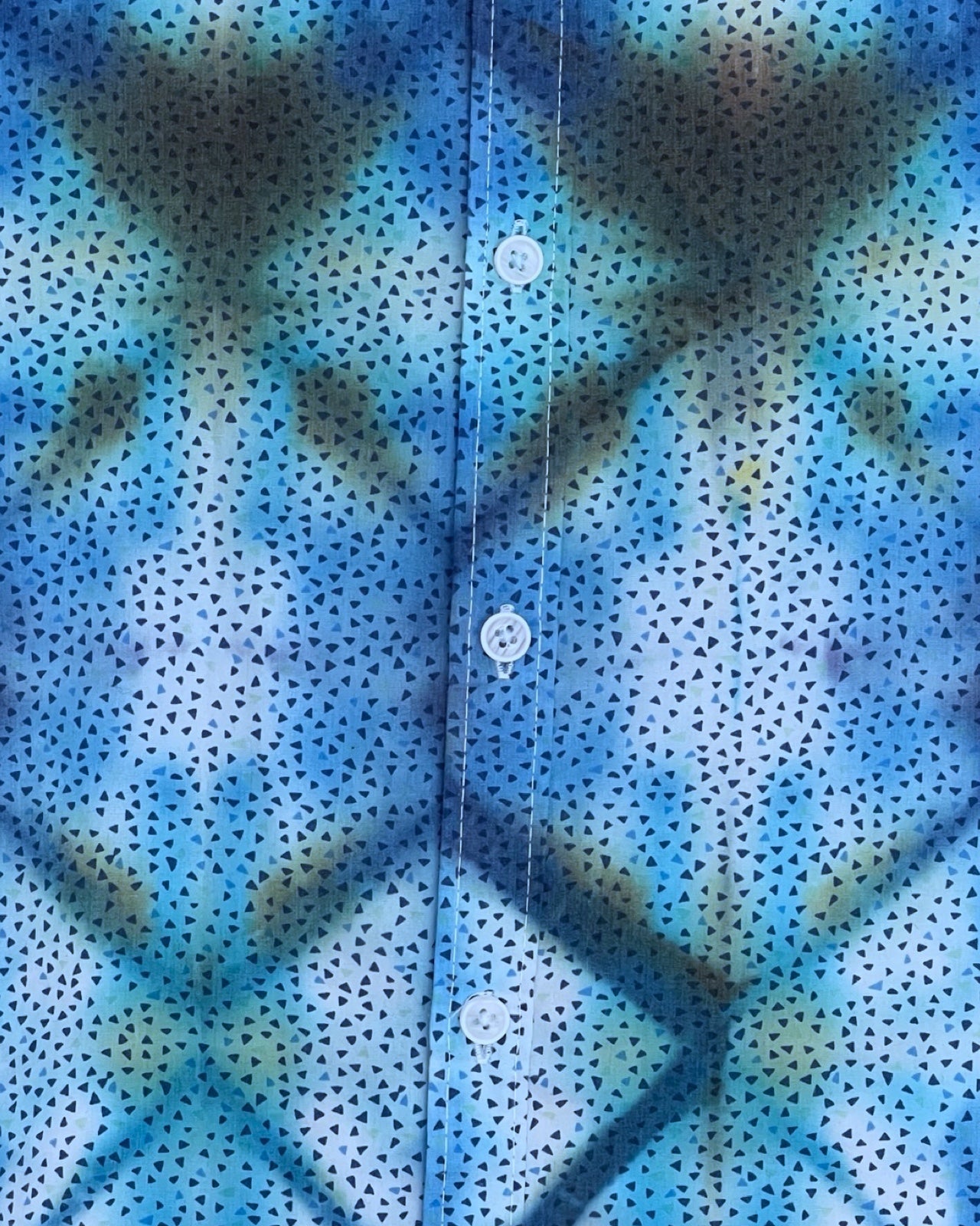 This unique up-cycled 100% cotton button down shirt is ice dyed in bold blues and green over a tiny triangle pattern. Hand tied and dye in a Shibori style flag fold. Featuring a single left side pocket and camp collar. Size XL
