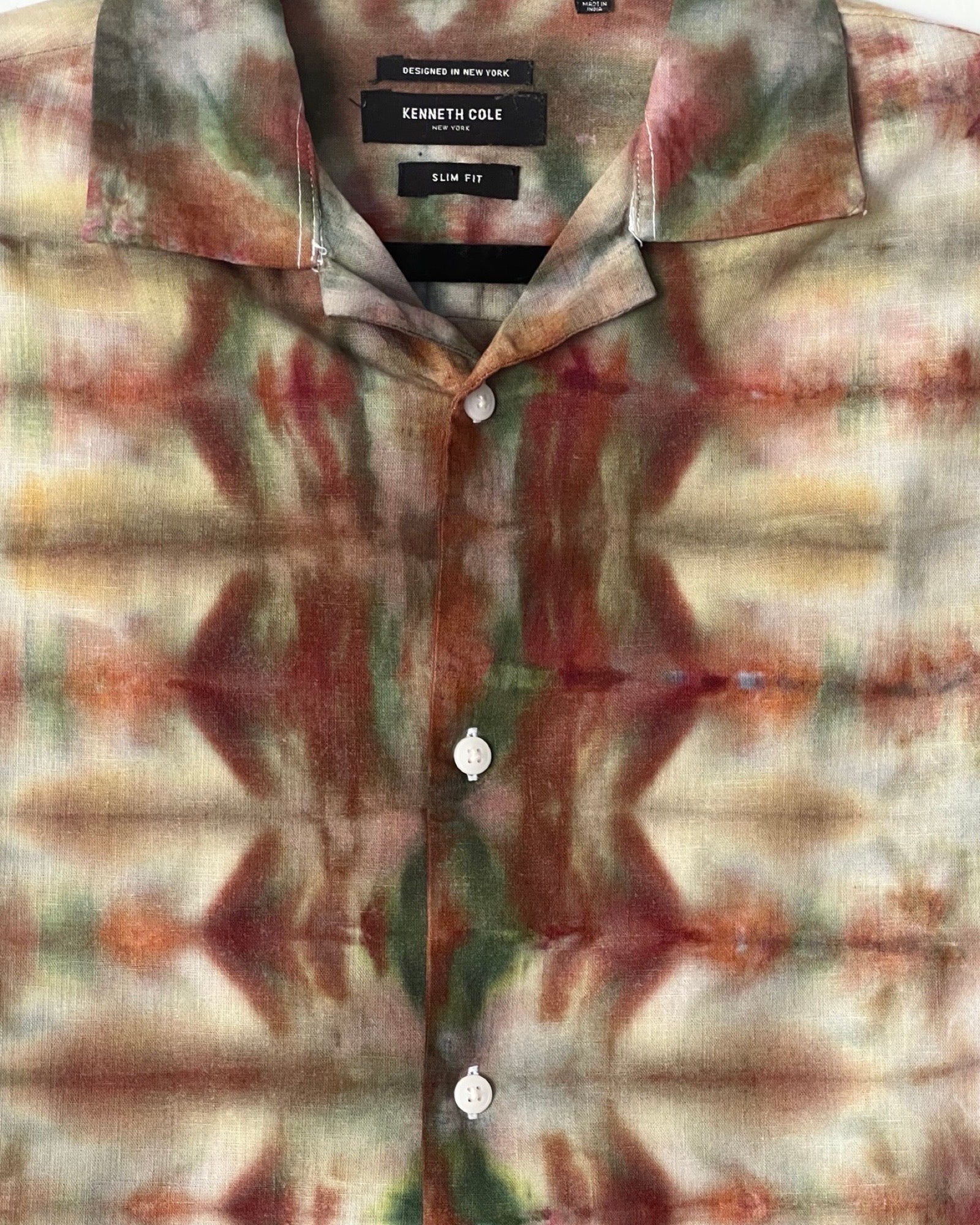 New, designer button down shirt ice dyed in earth colors of brown and green. Size medium, slim fit, and featuring a spread camp collar, this groovy top will turn heads. Soft 65% linen and 45% lyocell blend shirt is smooth and buttery.