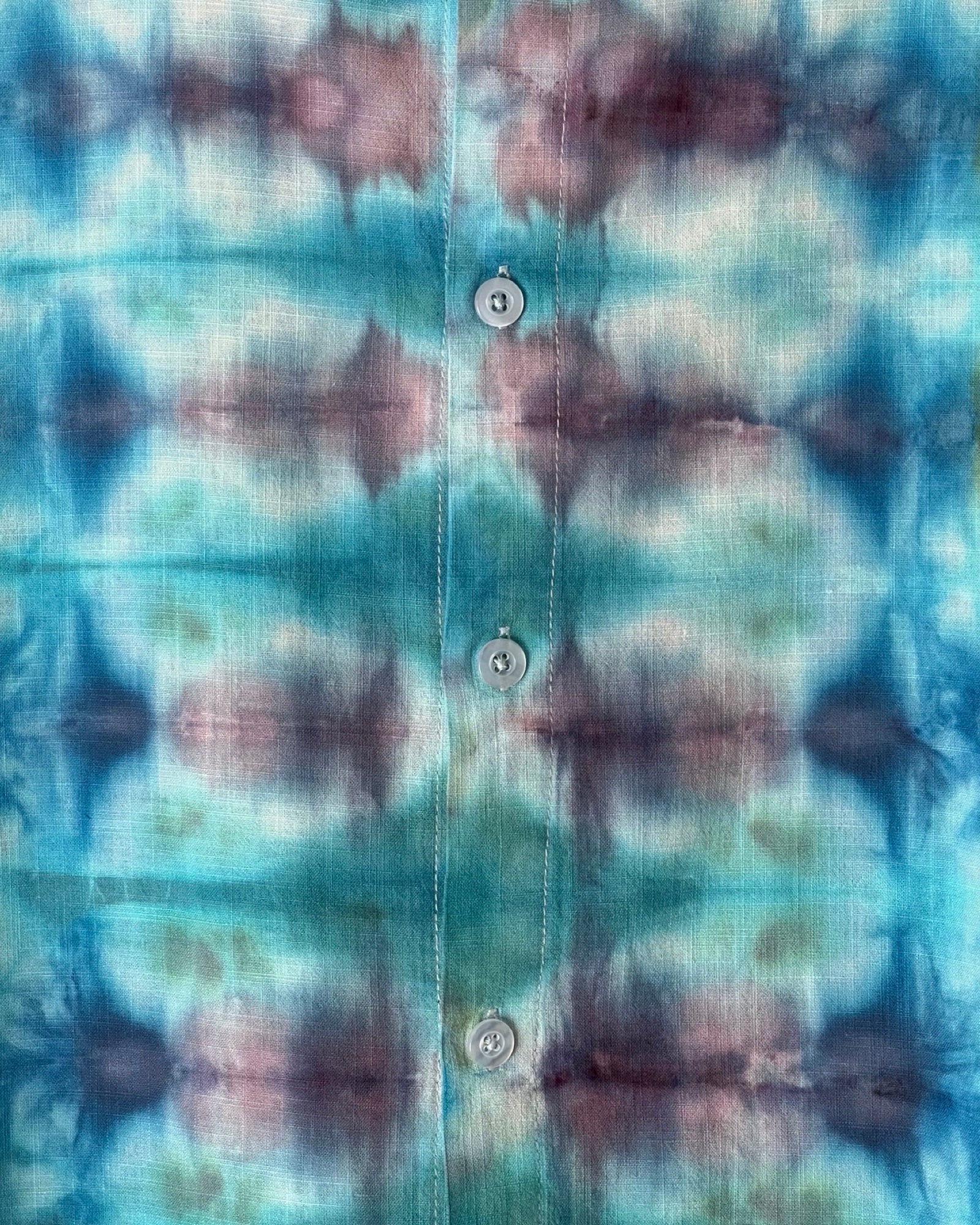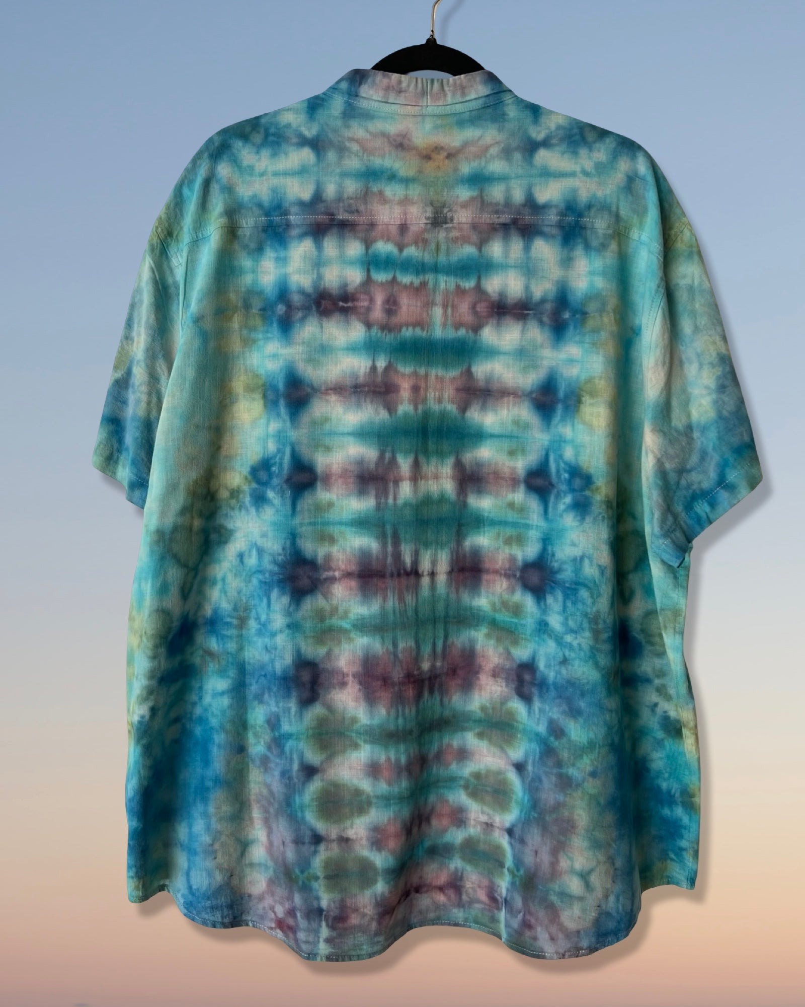 Mid-weight up-cycled 100% cotton short sleeve button down is ice dyed with Grecian blue and charcoal gray pleats. With a tiny small point collar and no pockets, this loose and casual shirt is perfect for poolside parties or fabulously fun nights out.