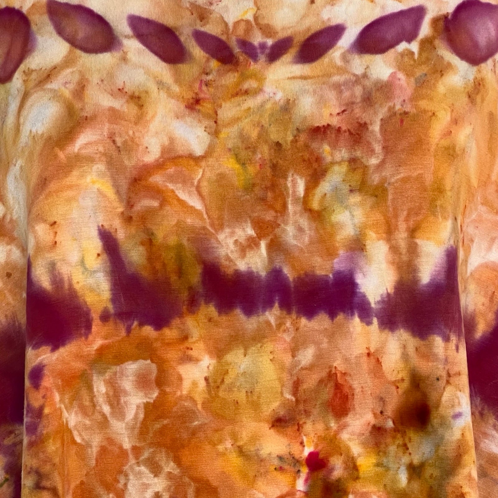Lightweight and airy this effortless layer top made from a soft rayon jersey, that features loose open sleeves and an unstructured silhouette. Ice dyed in round ch red violet and golden brown, we love to pair it with pants, skirts, or jeans.