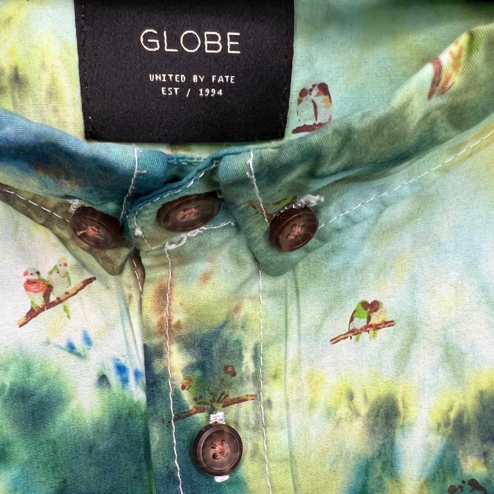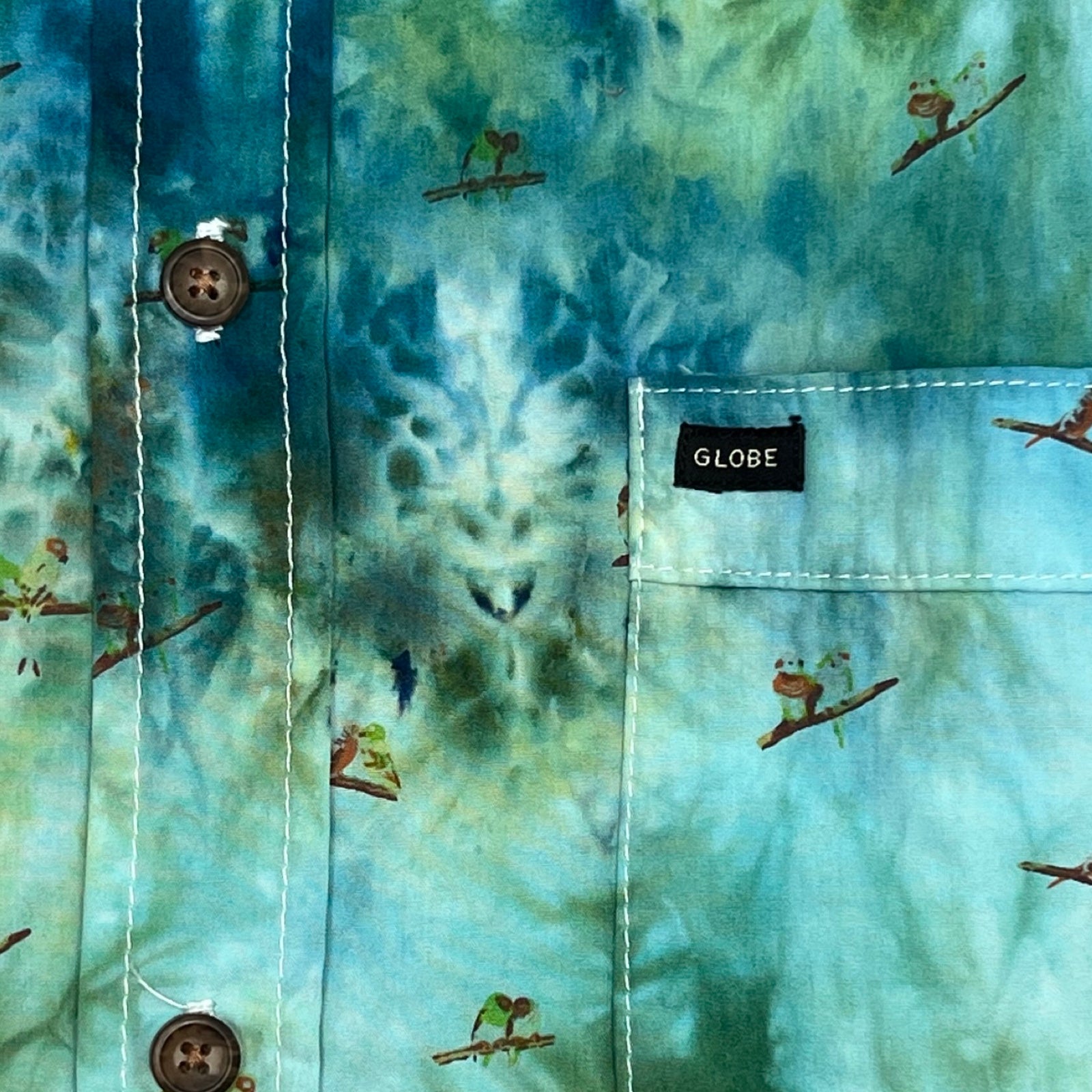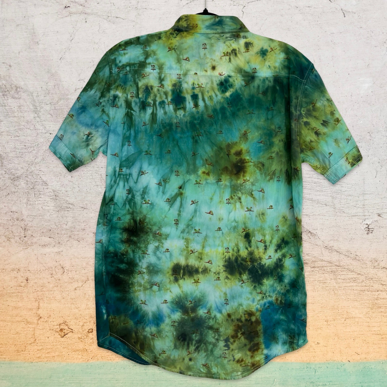 One of a kind up-cycled short sleeve surf style shirt with parrot print is geode ice dyed in tropical forest greens.