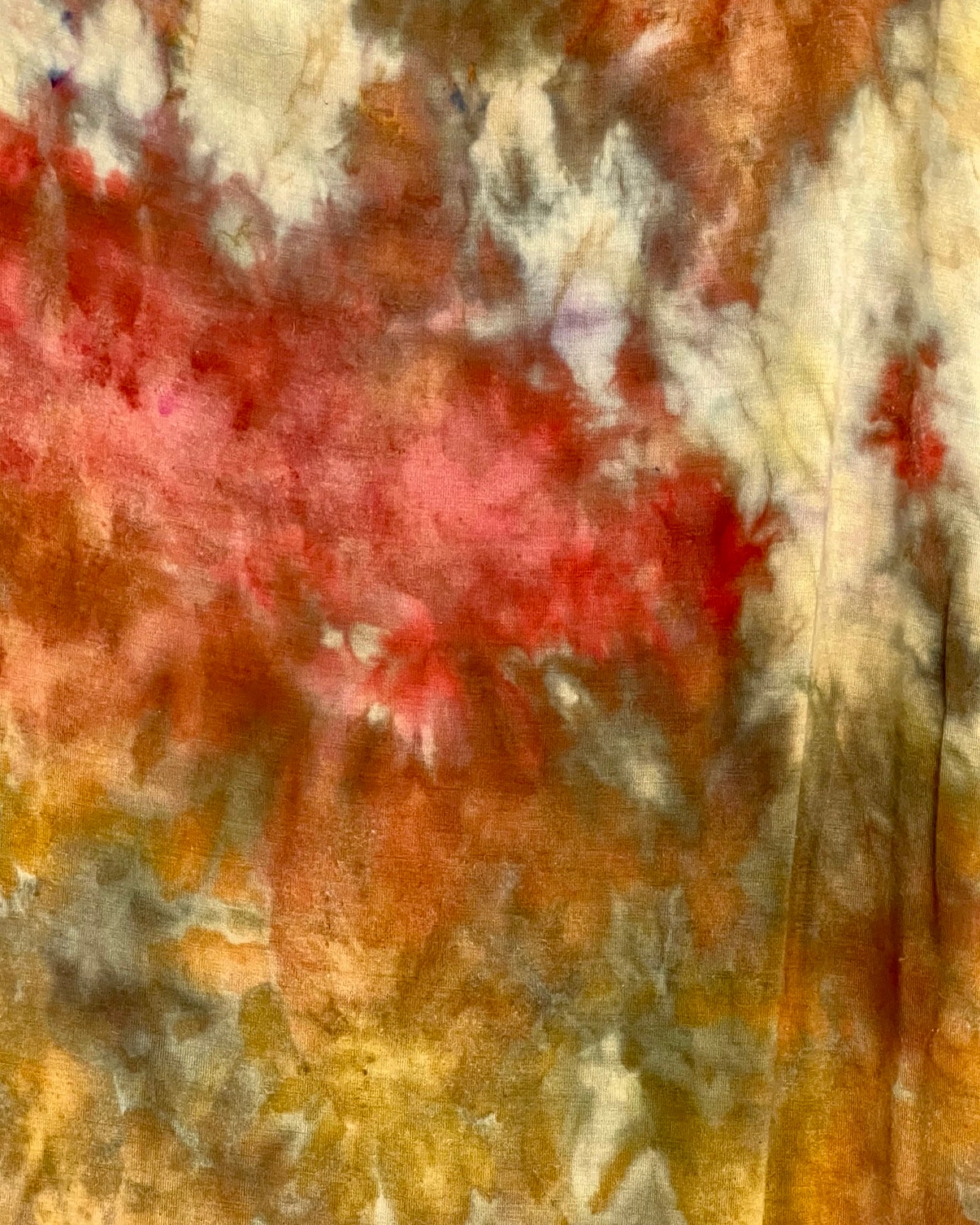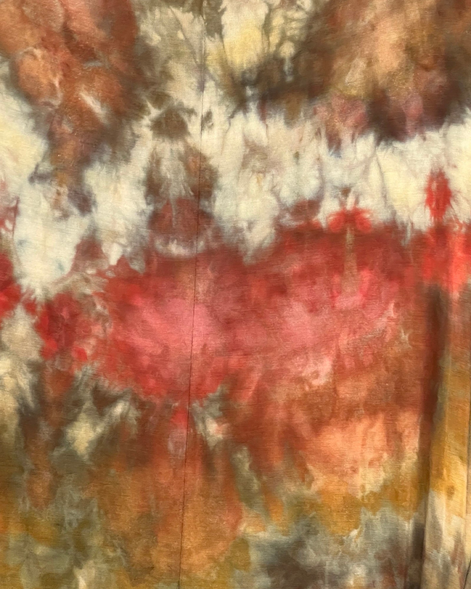 This lovely up-cycled loose fit ladies dolman style tunic with side ruching is ice dyed in dreamy desert colors of sagebrush, bronze, and rust. High quality up-cycled buttery rayon, this top is a one of a kind stunner is perfect to wear at a music festival or just lounging around the house.